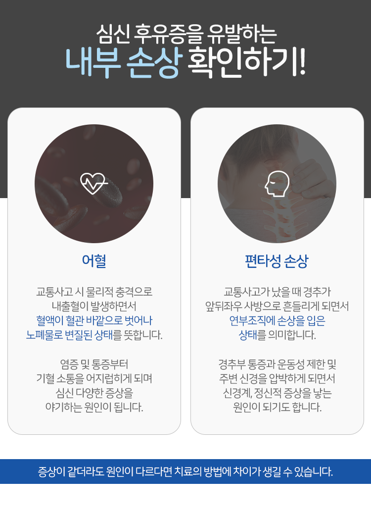그리고 이렇게 벌어진 교통사고는 단순히 당시의 물리적인 충격을 전달하는 데에서 그치는 게 아니라, 시간이 지나면서 다양한 후유증을 초래할 수 있기에 주의를 할 수 있도록 해야 한다 이야기를 드렸는데요. 초기에는 증상이 나타나지 않아 방치되기 쉬우나 갈수록 상태가 악화될 수 있는 게 후유증이었습니다. 따라서 사고 후에는 신속히 후유증을 관리하고 치료하는 것이 중요했는데요. 성산구 교통사고한의원에서는 어떠한 방식으로 케어를 도와드리는지 안내 드리도록 하겠습니다.