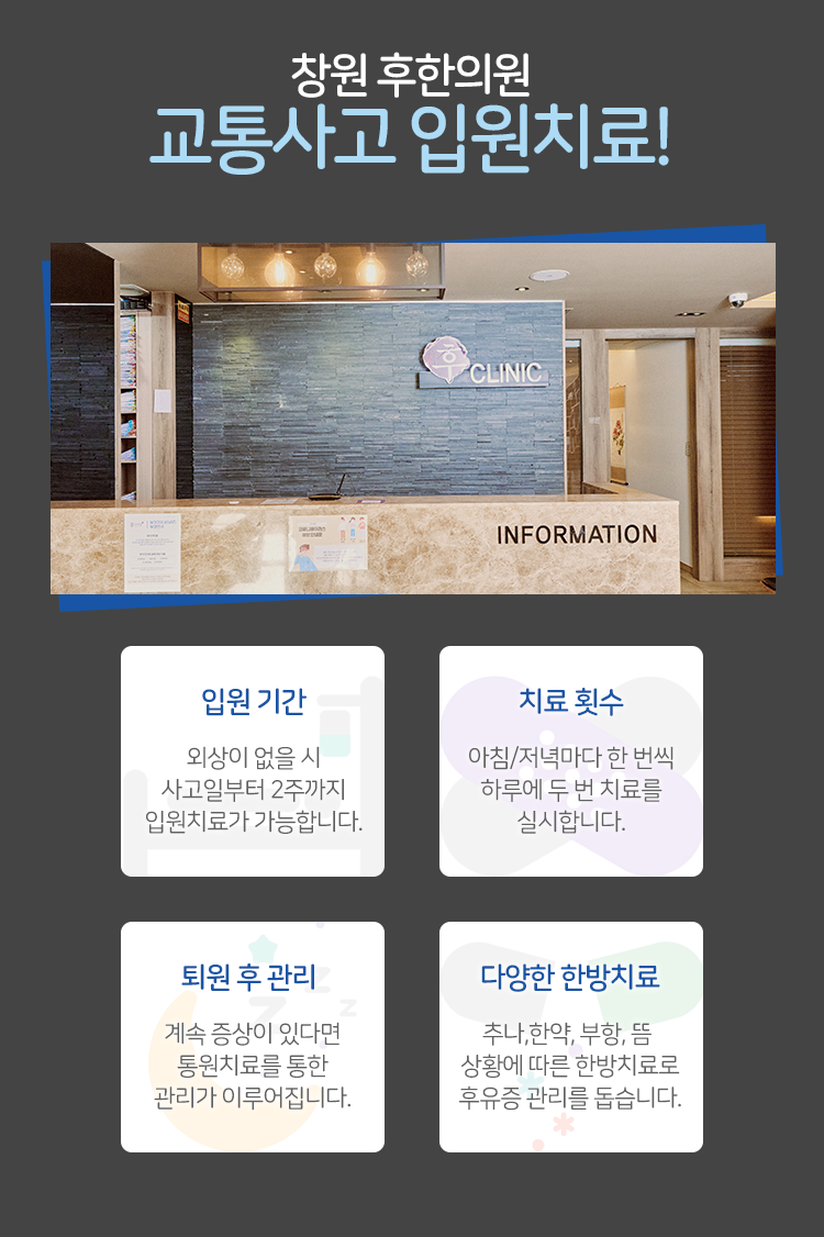 관리를 하지 않는 시간이 길어지게 된다면 그만큼 문제가 심각성을 더할 수 있다는 점도 계속해 강조 드렸습니다. 본원으로 걸음을 하시면 현재 내부 손상과 관련한 후유증이 어느 정도의 심각성을 띠고 있는지 확인하고 그것에 따라 다양한 한방치료로 회복까지 이바지를 할 것이라고 성산구 교통사고한의원이 안내 드렸습니다.