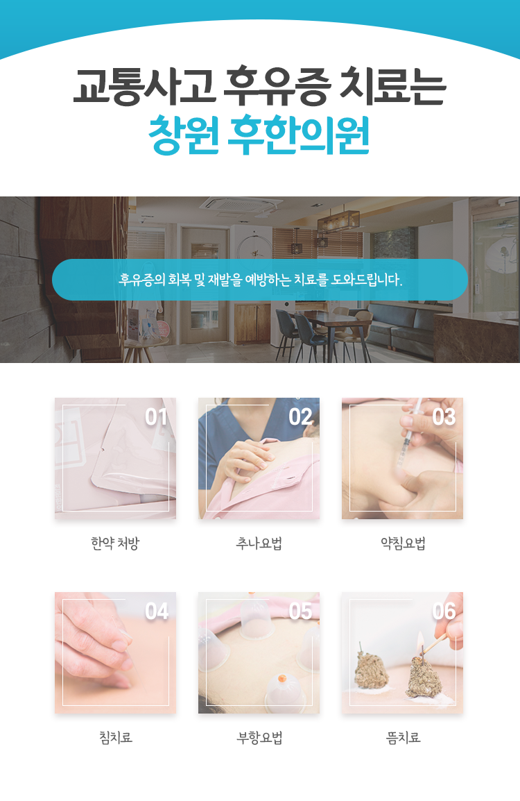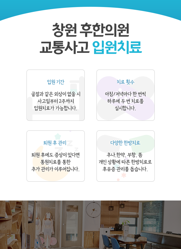 주로 진행이 되는 건 한약 처방, 약침, 부항, 추나 등이 있었습니다. 그리고 본원은 입원실을 운영하고 있기 때문에 창원교통사고치료한의원에서 진행이 되는 치료는 입원치료로도 이루어지고 있다는 점을 같이 설명할 수가 있었습니다.
